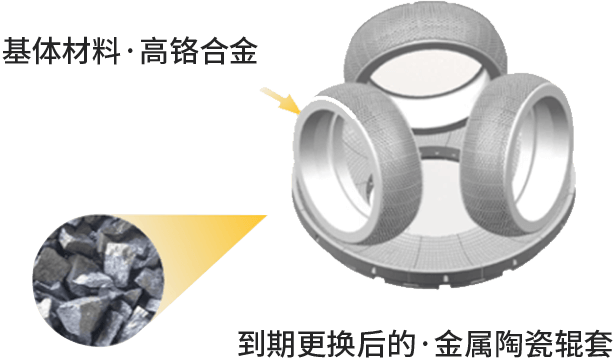 高鉻材質基體+陶瓷耐磨層,使用后廢舊金屬陶瓷輥套